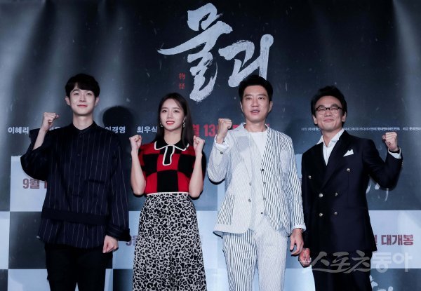 배우 최우식과 걸스데이 혜리, 배우 김명민, 김인권(왼쪽부터)이 16일 서울 광진구 롯데시네마 건대입구에서 열린 영화 ‘물괴’ 제작보고회에 참석해 포즈를 취하고 있다.