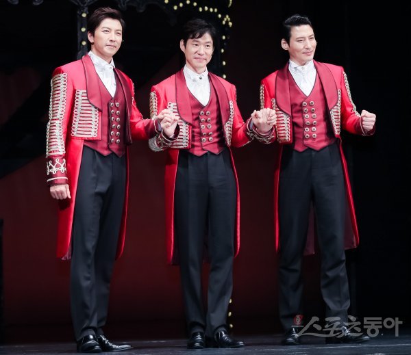 배우 박건형과 유준상, 김준현(왼쪽부터)이 16일 서울 중구 충무아트센터 대극장에서 열린 뮤지컬 ‘바넘: 위대한 쇼맨’ 프레스콜에 참석해 포즈를 취하고 있다.