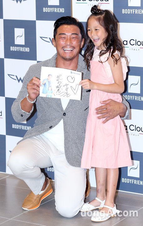 추성훈 추사랑 부녀가 17일 오후 서울 종로구 바디프랜드 매장에서 열린 바디프랜드 광화문 직영전시장 오픈 기념행사에 참석해 포즈를 취하고 있다.