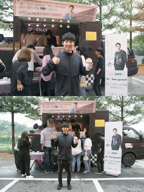 9월 12일 첫 방송 예정인 새로운 OCN 수목 오리지널 ‘손 the guest’(연출 김홍선, 극본 권소라 서재원)에서 주인공 윤화평 역을 맡은 김동욱이 무더위 속에서 촬영 중인 스태프들과 배우들을 격려하기 위해 시원한 커피차를 선물한 것.