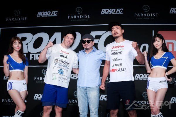17일 서울 광진구 비스타 워커힐 서울에서 XIAOMI ROAD FC 049 IN PARADISE 공식 계체량 행사가 열렸다. 제 6경기 미들급 이은수와 미즈노 타츠야(오른쪽)가 계체량을 마친 후 기념촬영을 하고 있다 .