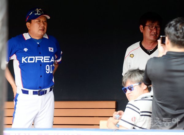 류중일 LG 감독이 선동열 대표팀 감독을 응원차 잠실야구장을 방문하고 있다.