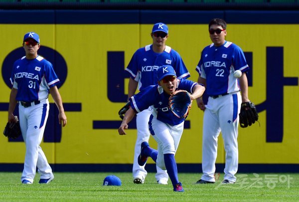 야구대표팀 박해민이 외야 수비를 훈련하고 있다.