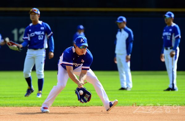 야구대표팀 김하성이 유격수 수비를 훈련하고 있다.