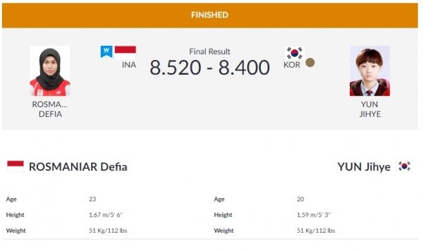 윤지혜는 4강에서 8.520점을 얻은 개최국 인도네시아의 로스마니아르 데피아를 상대로 8.400점을 얻는 데 그치며 동메달을 획득했다. 이 메달은 이번 대회 한국의 첫 메달이다.