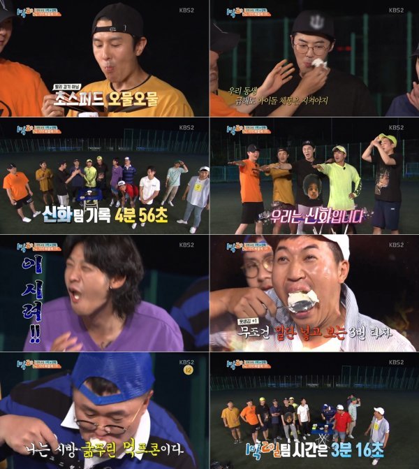 신화의 기록은 4분 56초였다. 놀라운 팀워크의 결과였다. ‘1박2일’ 팀은 김종민이 아이스크림을 잔뜩 입에 넣었다가 뱉어낼 위기에 처하기도 했다. 하지만 마지막 주자 데프콘의 활약으로 기록을 단축했다. 놀라운 속도로 아이스크림을 흡입하는 데프콘에 신혜성은 “밥 먹듯이 먹는다”고 감탄했다. ‘1박2일’ 팀의 기록은 3분 16초로 완벽한 승리를 거머쥐었다.
