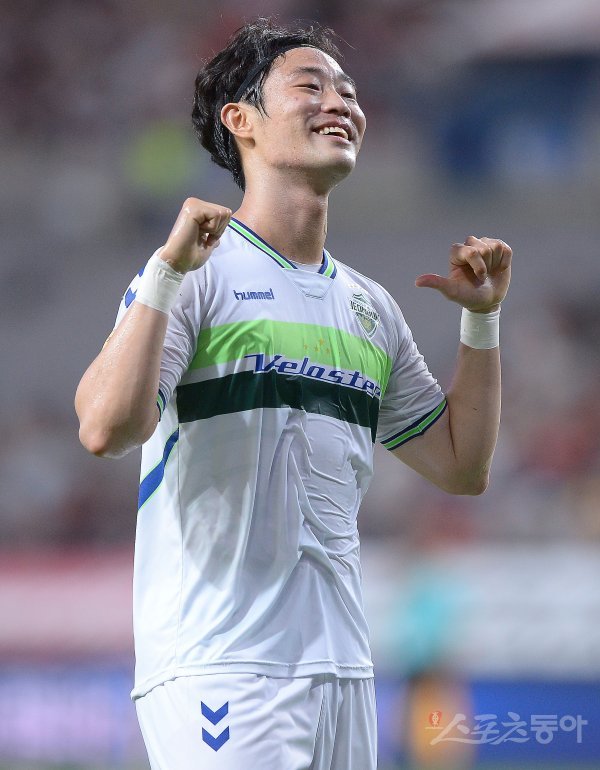 전반 VAR 판독 끝에 코너킥 상황에서 골을 넣은 전북 최보경이 원정 응원 온 서포터들을 향해 세리머니를 펼치고 있다.