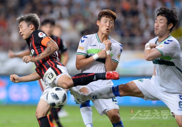 전반 서울 고요한과 전북 손준호, 최보경(왼쪽부터)이 크로스 온 공을 향해 발을 뻗고 있다.