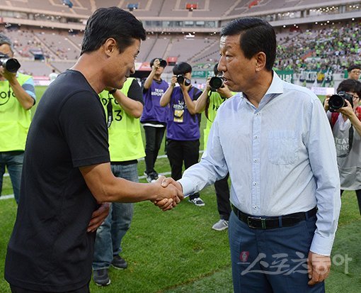 19일 서울월드컵경기장에서 ‘KEB하나은행 K리그 1 2018‘ 24라운드 FC서울과 전북현대의 경기가 열렸다. 경기를 앞두고 서울 이을용 감독대행과 전북 최강희 감독(오른쪽)이 인사를 나누고 있다. 상암|김진환 기자 kwangshin00@donga.com