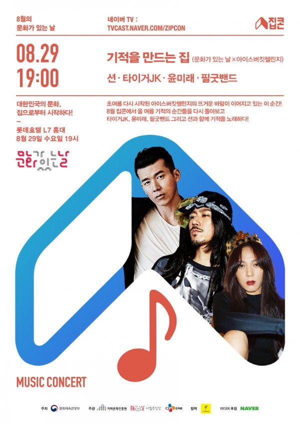 매달 마지막 수요일 ‘문화가 있는 날’에 진행되는 '집콘'이 오는 8월 29일, 가수 션, 타이거JK, 윤미래, 그리고 필굿밴드와 함께 ’기적을 만드는 집’이란 이름으로 롯데호텔 L7 홍대에서 펼쳐진다.