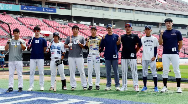 20일 경기도 수원 kt위즈파크에서 해외 아마 및 프로 출신 선수와 고교·대학 중퇴 선수 등을 대상으로 한 트라이아웃이 열렸다. 하재훈(왼쪽부터), 이학주, 이복건, 김성민, 한선태, 이대은, 윤정현, 안현수, 김대영이 카메라를 향해 포즈를 취하고 있다.