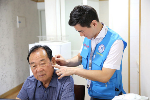 대원제약은 제21차 남북 이산가족 상봉행사에 1억원 상당의 보청기와 의약품을 지원했다. 딜라이트 이기도 센터장(오른쪽)이 고호준 할아버지(충북 거주, 77세, 왼쪽)의 딜라이트 보청기 착용을 돕고 있다.