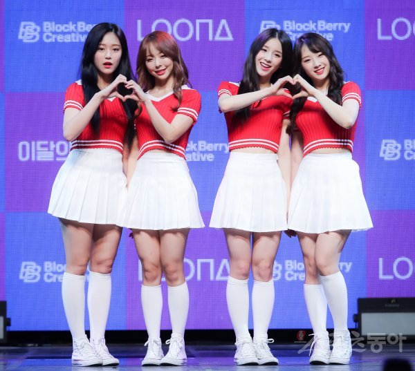 걸그룹 이달의 소녀의 유닛 그룹 이달의 소녀 1/3의 현진, 비비, 희진, 하슬(왼쪽부터)이 20일 서울 용산구 한남동 블루스퀘어에서 열린 데뷔 미니앨범 ‘+ +’ (플러스 플러스) 발매 기념 쇼케이스에서 포즈를 취하고 있다.