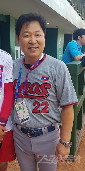 이만수 라오스 야구협회 부회장이 지난 19일 자카르타 GBK 스타디움에서 열린 공식 훈련에 앞서 사진촬영을 하고 있다. 스포츠동아DB