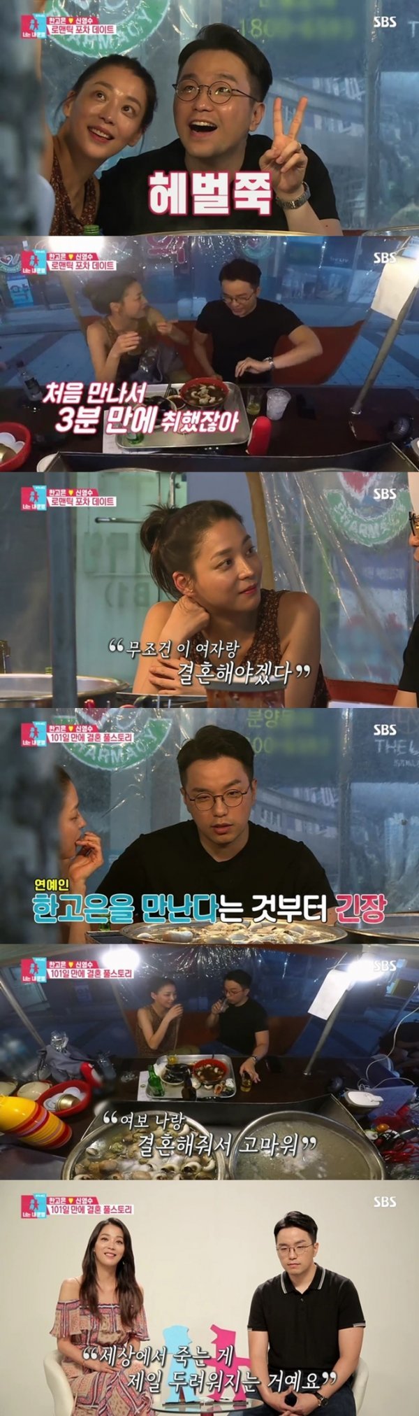 한고은과 신영수는 주말을 맞아 포장마차 데이트에 나섰다. 두 사람은 맛있는 안주와 술을 즐기며 소개팅으로 이어진 두 사람의 첫만남부터 시작해 결혼에 골인하기까지 러브스토리를 회상했다.