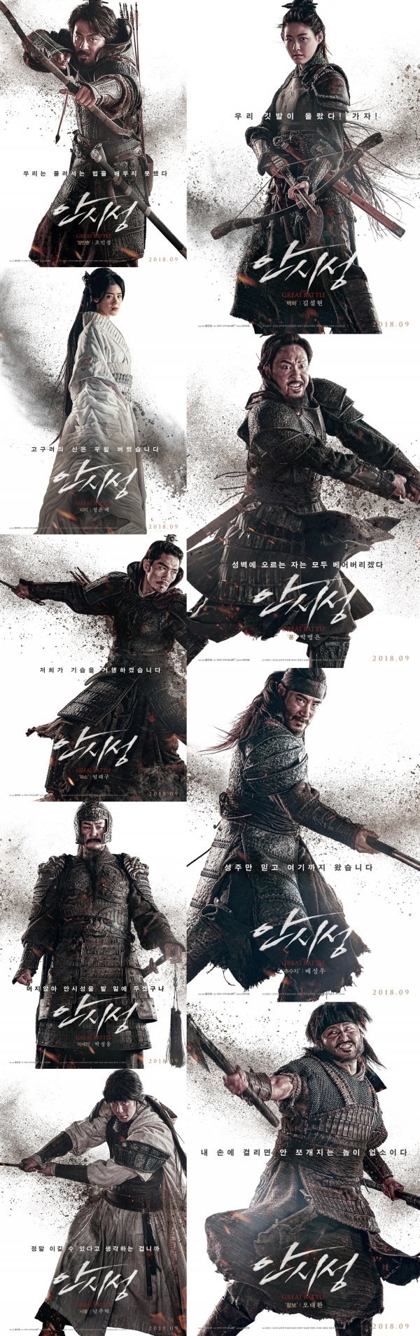 영화 \'안시성\'은 동아시아 전쟁사에서 가장 극적이고 위대한 승리로 전해지는 88일간의 안시성 전투를 그린 초대형 액션 블록버스터. 9월 19일 개봉작 중 유일한 액션 블록버스터로 올 추석 극장가를 장악할 \'안시성\'이 스케일에 걸맞는 스타일리시 캐릭터 포스터 9종을 공개했다.