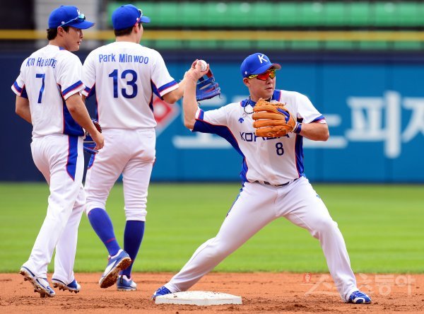 야구대표팀 안치홍이 2루 수비를 훈련하고 있다.