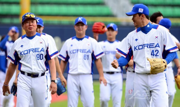 야구대표팀 선동열 감독이 장필준과 이야기를 나누고 있다.