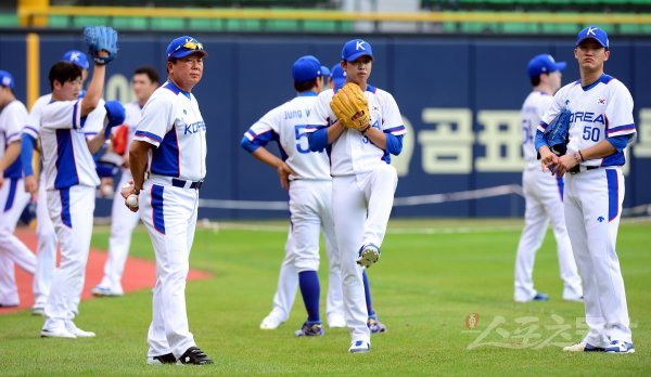 야구대표팀 선동열 감독이 투수들의 훈련을 지켜보고 있다.
