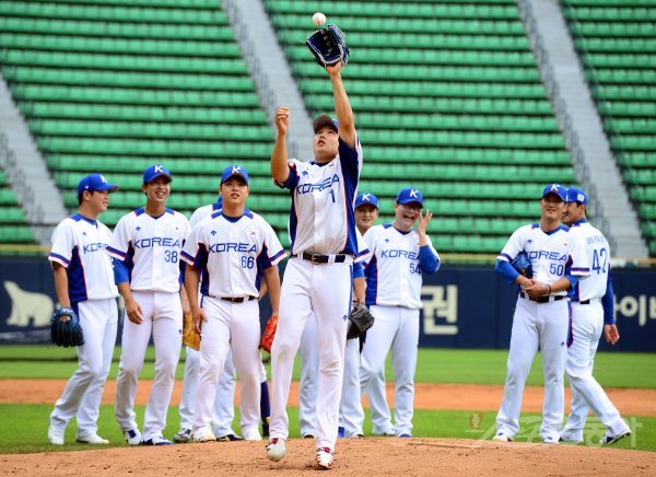 야구대표팀 임찬규가 투수 앞 땅볼 타구를 수비하고 있다.