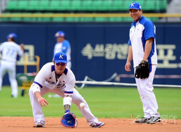 야구대표팀 박병호가 김현수가 지켜보는 가운데 1루 수비를 훈련하고 있다.