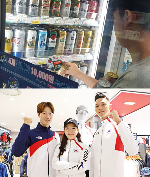 아시안게임 시즌을 맞아 편의점 GS25에서 맥주를 구매하고 있는 고객(위쪽)과 롯데백화점 ‘스포츠·레저 박람회’에서 대한민국 국가대표팀 팀복을 착용한 모델들. 유통업계의 아시안게임 마케팅이 한창이다. 사진제공|GS25·롯데백화점