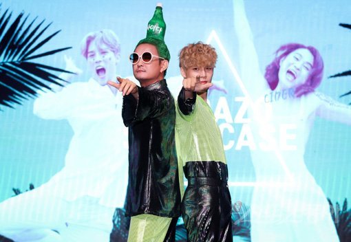 그는 기존 활동에서 선보였던 ‘삼각김밥 머리’ ‘용비녀 머리’ ‘슈퍼맨 분장’ ‘반인반마 켄타우로스’ 등 기상천외한 분장에 이어 이번엔 신곡 ‘사이다’에 맞춰 사이다를 모형으로 만들어 머리 위에 얹었다. 머리색도 녹색으로 바꿨다.