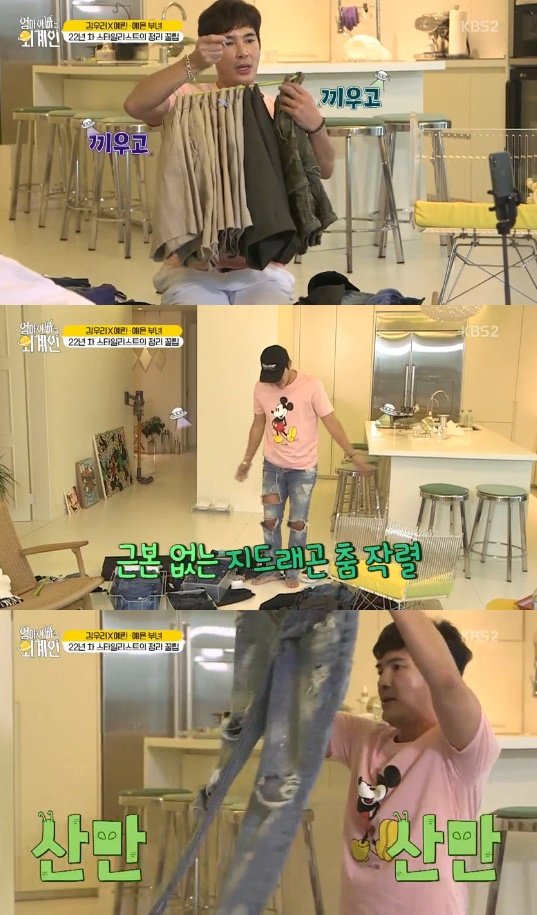 김우리는 여름 옷을 정리했다. 추억의 청바지를 꺼내들다가 "이거 지드래곤이 입어서 히트친 건데 이 나이에 따라해보겠다고 참"이라며 지드래곤 청바지를 입었다.