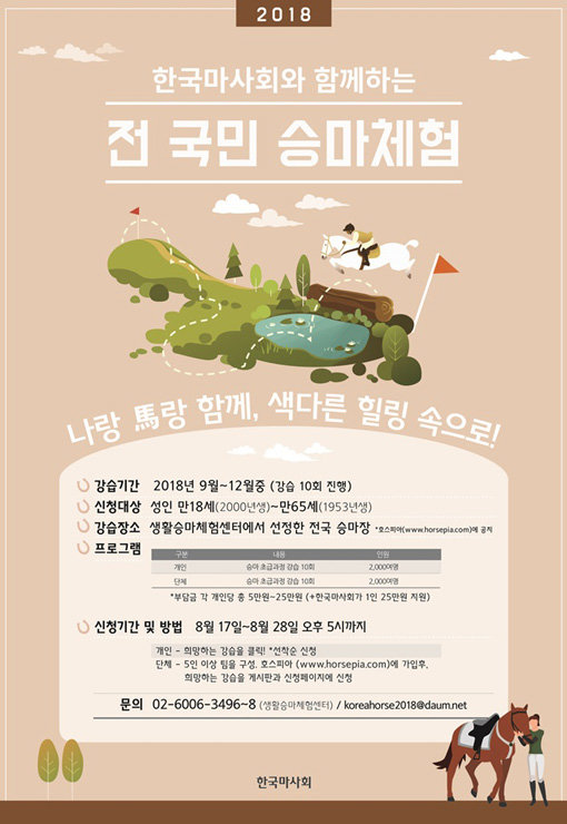 전국민 승마체험 관련 문의는 한국마사회 생활승마체험센터 또는 이메일로 하면 된다.