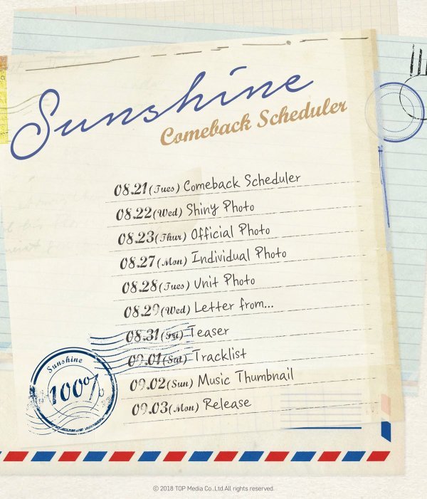 업로드 된 스케줄러 이미지는 마치 편지 같은 느낌을 주며 이번 새 앨범 ‘Sunshine’에 어떠한 감성의 이야기들이 담길 지 컴백에 대한 기대감을 높였다.