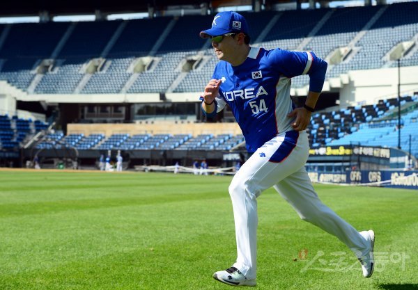 야구대표팀 양현종이 가볍게 달리며 몸을 풀고 있다.