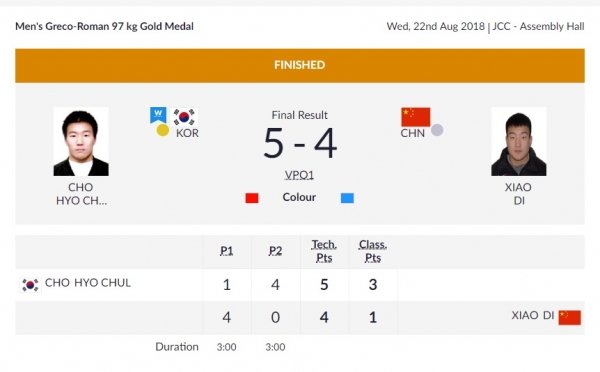 조효철은 22일(이하 한국시각) 인도네시아 자카르타컨벤션센터에서 열린 2018 자카르타-팔렘방 아시안게임 레슬링 그레코로만형 97kg급 결승전에서 중국의 샤오 디에게 5-4로 승리했다.
