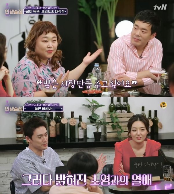 23일 방송된 tvN ‘인생술집’ 에는 결혼 2년 차 아나운서 부부 오상진·김소영과 연애 9년 차 예비 부부 코미디언 김민기·홍윤화가 출연해 로맨틱한 입담을 펼쳤다.