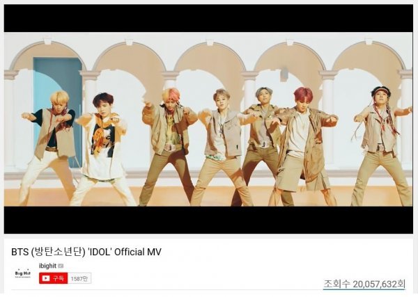 방탄소년단의 ‘IDOL’ 뮤직비디오는 24일 오후 6시 공식 유튜브 채널을 통해 공개된 후 6시간 35분만인 25일 오전 12시 35분경 조회수 2000만건을 넘었다. 앞서 24일 오후 10시 16분경에는 공개 4시간 16분 만에 1000만건의 조회수를 돌파했다.