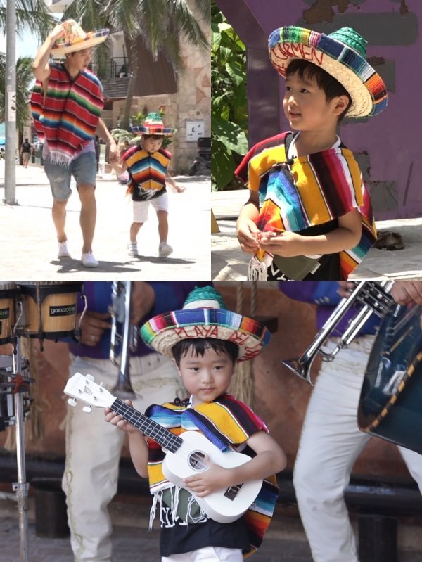 사진 속 승재와 지용 아빠는 멕시코 악사 마리아치로 변신했다. 머리부터 발끝까지 완벽하게 변신한 고고부자의 모습이 눈길을 끈다. 알록달록한 모자부터 판초, 우쿨렐레까지. 앙증맞은 승재의 모습이 사랑스럽다. 특히 비장한 표정으로 열심히 우쿨렐레를 연주하는 승재의 모습은 눈 뗄 수 없게 만든다.