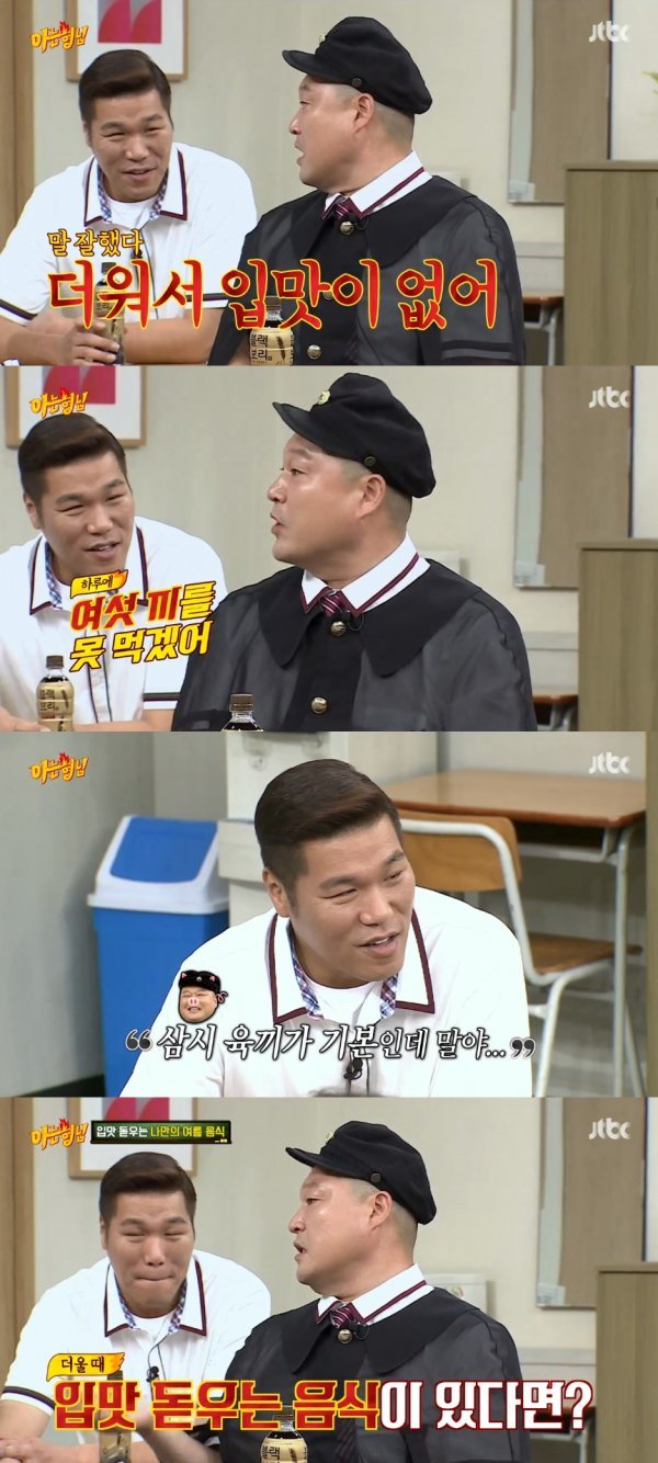25일 오후 방송된 JTBC ‘아는형님’에는 강호동은 “날씨가 더우니까 입맛이 달아나더라. 하루에 여섯 끼를 못 먹겠다”고 말했다.