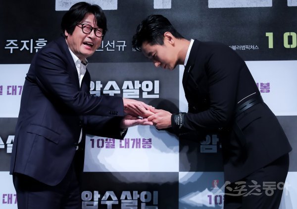 배우 김윤석과 주지훈(오른쪽)이 28일 서울 강남구 압구정로에 위치한 CGV 압구정에서 열린 영화 ‘암수살인’ 제작보고회에서 포즈를 취하고 있다.