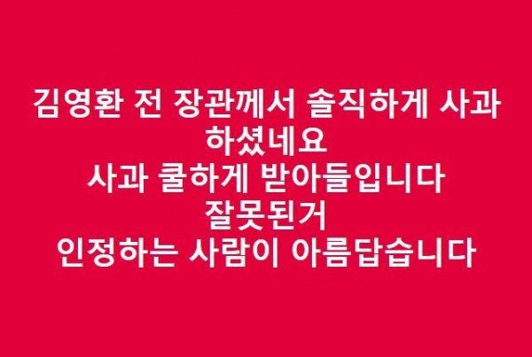 김부선은 28일 오후 자신의 페이스북에 "김영환 전 장관께서 솔직하게 사과하셨네요. 사과 쿨하게 받아들입니다. 잘못된거 인정하는 사람이 아름답습니다"라는 글을 올렸다.