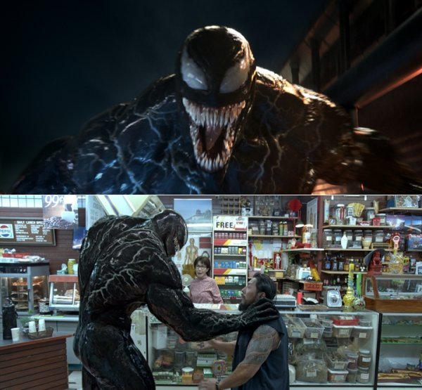 여기에 본 적 없는 강렬하고도 야성적인 인상의 ‘베놈’ 비주얼이 보는 이의 시선을 완전히 빼앗는다. 위압적인 얼굴부터 거대한 근육에 이르기까지 디테일하게 구현된 ‘베놈’의 모습은 코믹스에서 튀어나온 듯한 완성도로 구현되어 눈길을 끈다. 특히 강력한 포스의 ‘베놈’이 늦은 밤 상점 주인을 위협하는 한 남성의 어깨를 붙잡은 모습은 지금까지의 히어로들과는 전혀 다른 활약을 펼칠 캐릭터에 대한 호기심을 높인다. 한편, 어두운 거리에서 오토바이에 올라탄 ‘에디 브록’의 모습은 영화 속에서 펼쳐질 액션 장면들에 대한 기대를 고조시킨다.