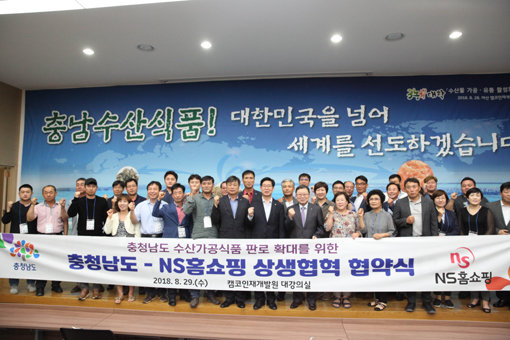 NS홈쇼핑과 충청남도가 29일 충남 아산 캠코인재원에서 수산물 가공 식품 유통활성화를 위한 업무 협약식을 열었다. 이번 협약을 통해 NS홈쇼핑은 충청남도 수산 가공식품 판로 개척과 유통 활성화를 돕는다. 또 충청남도는 우수한 수산물 가공 식품을 발굴해 TV홈쇼핑, 온라인몰 판매를 위한 수산 가공식품 상품화에 협조하기로 했다.