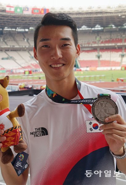 2018자카르타-팔렘방아시안게임 남자 높이뛰기에서 은메달을 딴 육상대표팀 우상혁. 국민체육진흥공단 한국스포츠정책과학원 스포츠과학밀착지원팀은 우상혁의 도약 전 3보에 대한 특성을 정밀 분석해 기록에 최적화된 디딤발의 위치와 각도를 제시함으로써 이 종목 16년 만의 메달 회득에 기여했다. 자카르타|동아일보 임보미 기자 bom@donga.com