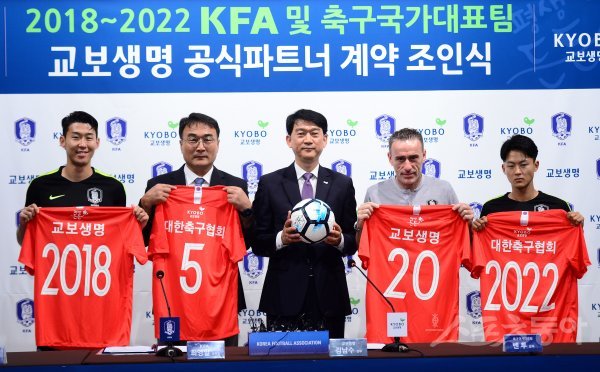훈련에 앞서 교보생명 공식파트너 계약 조인식에 참석한 손흥민, 최영일 부회장, 김남수 교보생명 상무, 벤투 감독, 이승우가 기념촬영을 하고 있다.