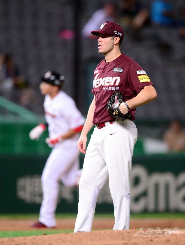 넥센 선발 브리검이 3회말 2사 2루 SK 한동민에게 동점을 만드는 우월 투런 홈런을 허용한 후 아쉬워하고 있다.