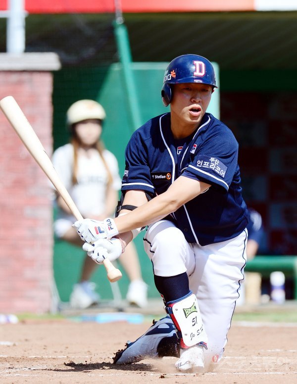 2회초 2사 2루에서 두산 정수빈이 헛스윙 삼진 아웃을 당하고 있다.