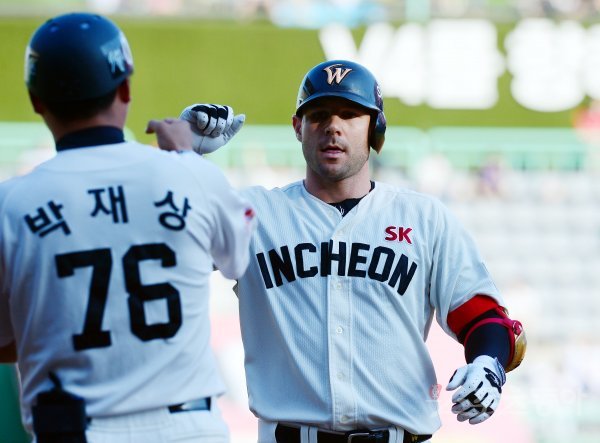 8회말 무사 만루에서 SK 로맥이 2타점 적시타를 치고 난 뒤 박재상 코치의 환영을 받고 있다.