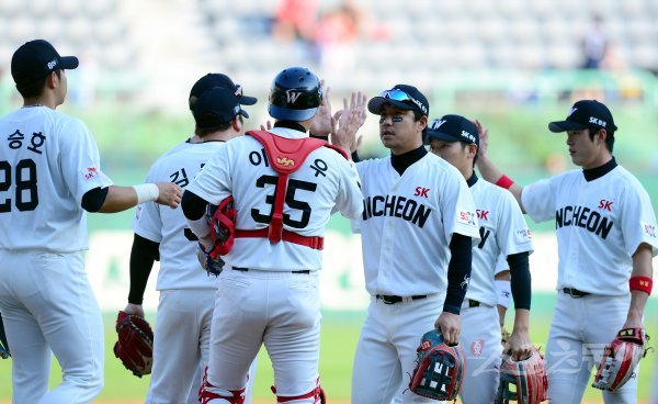 SK가 두산에 14-2로 승리한 뒤 선수들이 그라운드에서 기쁨을 나누고 있다.