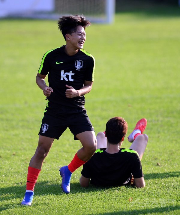 훈련 전 이승우가 볼뺏기 게임을 하고 있다.