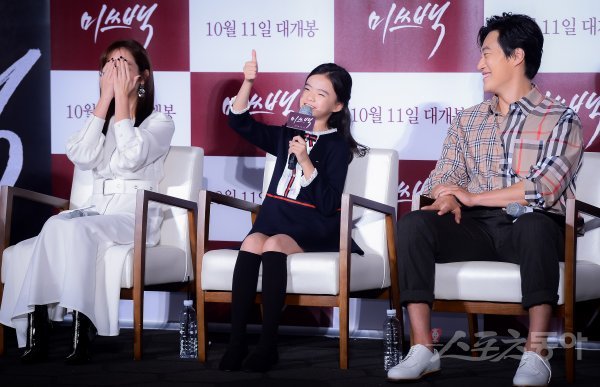 배우 김시아(가운데)가 11일 서울 광진구 롯데시네마 건대입구에서 열린 영화 ‘미쓰백’ 제작보고회에 참석해 한지민에 대한 질문에 엄지손가락을 내밀고 있다.