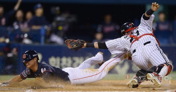 8회초 1사 2,3루에서 롯데 나경민이 손아섭의 1루수 앞 땅볼 상황에서 홈으로 쇄도해 세이프 되고 있다.
