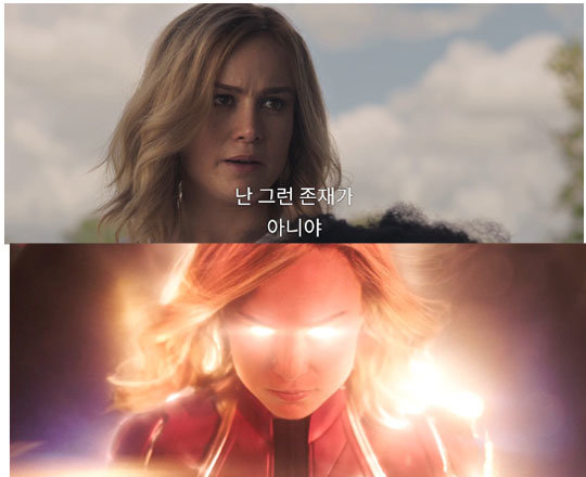 “난 이탈한 군인이라면 한 눈에 알아보지만 하늘에서 떨어진 경우는 처음이야”라는 대사와 함께 나타난 닉 퓨리는 안대를 벗고 있어 관객들을 깜짝 놀라게 만들 것으로 보인다. 캐롤 댄버스의 비상한 초능력에서 강력함을, 차가운 표정에서 신비로운 매력을 느낄 수 있다.